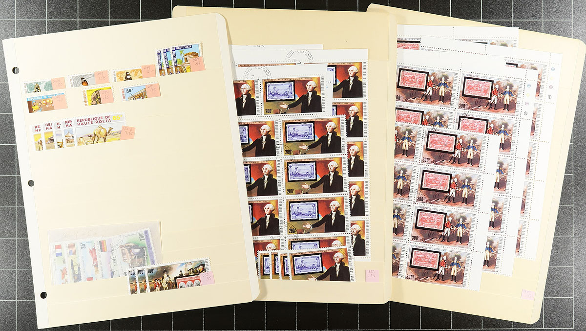 Part 1: "A" to "C" colonies. Collector’s neatly organized duplicates of several formerly French administered colonies in Africa. Mint and used, with up to a dozen of a type, with some nice cancels and items identified by Scott number and (older) catalogue values. We note: Afars and Issas (#C58-59, 2 sets), Burkina Faso (Upper Volta) - lots of "Camels", and some nice airmail and postage due material. Central African Republic has few duplicates, noting better air mails, and #M1-M2. Chad has some nice overprints, butterfly topicals, finishing with a bit of material from the Comoro Islands. Not often seen material, in very nice condition, with values that will add up quickly. Estimate =