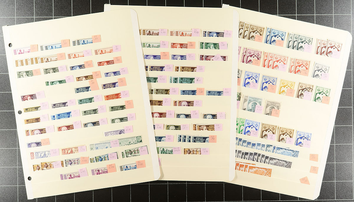 Part 2: "D" to "I" colonies. Collector’s neatly organized duplicates of several formerly French administered colonies in Africa. Mint and used, with up to a dozen of a type, with some nice cancels, back of the book with items identified by Scott number and (older) catalogue values. Some highlights include: a nice selection from Diego-Suarez from the "Navigation and Commerce" issue, a page of Djibouti, some Equatorial Africa (#121), French West Africa (lots of nice airmail and the O1-O12 set). Guinea includes some mint singles and there are a couple of pages of Inini overprints. Not often seen material, in very nice condition, with values that will add up quickly. 23 manila stockpages. Estimate =