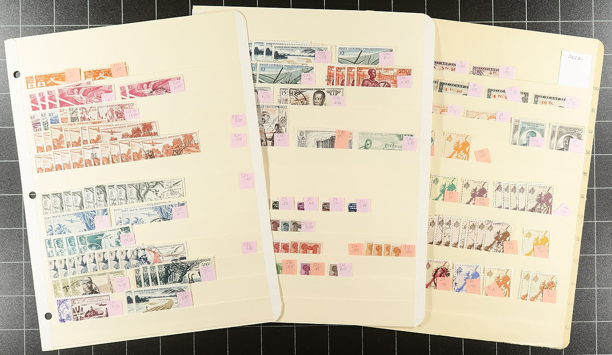 Part 2: "D" to "I" colonies. Collector’s neatly organized duplicates of several formerly French administered colonies in Africa. Mint and used, with up to a dozen of a type, with some nice cancels, back of the book with items identified by Scott number and (older) catalogue values. Some highlights include: a nice selection from Diego-Suarez from the "Navigation and Commerce" issue, a page of Djibouti, some Equatorial Africa (#121), French West Africa (lots of nice airmail and the O1-O12 set). Guinea includes some mint singles and there are a couple of pages of Inini overprints. Not often seen material, in very nice condition, with values that will add up quickly. 23 manila stockpages. Estimate =