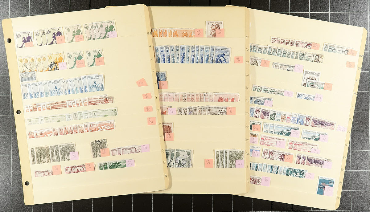 Part 2: "D" to "I" colonies. Collector’s neatly organized duplicates of several formerly French administered colonies in Africa. Mint and used, with up to a dozen of a type, with some nice cancels, back of the book with items identified by Scott number and (older) catalogue values. Some highlights include: a nice selection from Diego-Suarez from the "Navigation and Commerce" issue, a page of Djibouti, some Equatorial Africa (#121), French West Africa (lots of nice airmail and the O1-O12 set). Guinea includes some mint singles and there are a couple of pages of Inini overprints. Not often seen material, in very nice condition, with values that will add up quickly. 23 manila stockpages. Estimate =
