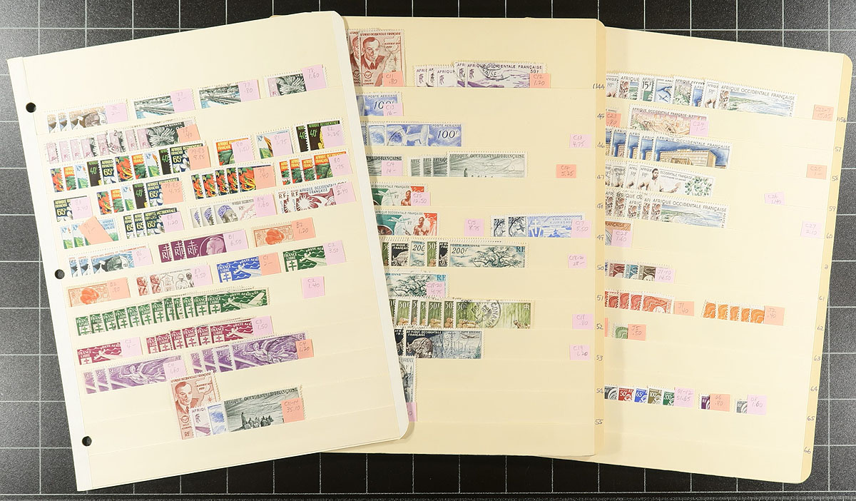 Part 2: "D" to "I" colonies. Collector’s neatly organized duplicates of several formerly French administered colonies in Africa. Mint and used, with up to a dozen of a type, with some nice cancels, back of the book with items identified by Scott number and (older) catalogue values. Some highlights include: a nice selection from Diego-Suarez from the "Navigation and Commerce" issue, a page of Djibouti, some Equatorial Africa (#121), French West Africa (lots of nice airmail and the O1-O12 set). Guinea includes some mint singles and there are a couple of pages of Inini overprints. Not often seen material, in very nice condition, with values that will add up quickly. 23 manila stockpages. Estimate =