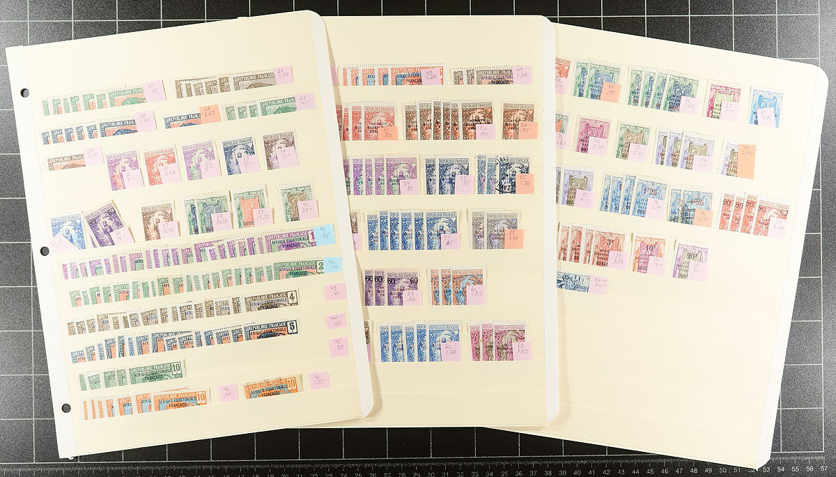 Part 3: "M" to "S" colonies. Collector’s neatly organized duplicates of several formerly French administered colonies in Africa. Mint and used, with up to a dozen of a type, with some nice cancels, "back of the book" with items identified by Scott number and (older) catalogue values. Some highlights include: a bit of Mali (#C5-C8), Mauritania, some Mayotte "Navigation and Commerce" (same for Moheli, Nossi-be and Ste Marie de Madagascar). There are touches of Obock, Rouad, a few pages of "Oubangi-Chari" overprints and more! Not often seen material, in very nice condition, with values that will add up quickly (as there are sets and singles with catalogue values to $30.00). 30 manila stockpages. Estimate =