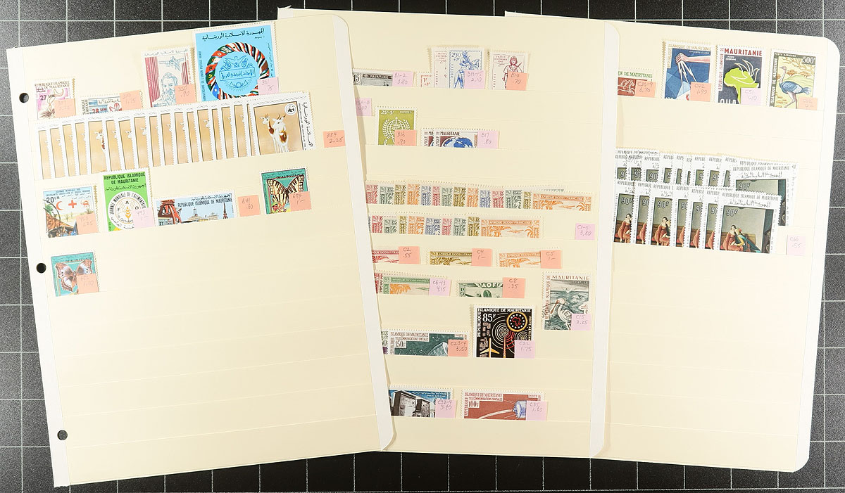 Part 3: "M" to "S" colonies. Collector’s neatly organized duplicates of several formerly French administered colonies in Africa. Mint and used, with up to a dozen of a type, with some nice cancels, "back of the book" with items identified by Scott number and (older) catalogue values. Some highlights include: a bit of Mali (#C5-C8), Mauritania, some Mayotte "Navigation and Commerce" (same for Moheli, Nossi-be and Ste Marie de Madagascar). There are touches of Obock, Rouad, a few pages of "Oubangi-Chari" overprints and more! Not often seen material, in very nice condition, with values that will add up quickly (as there are sets and singles with catalogue values to $30.00). 30 manila stockpages. Estimate =