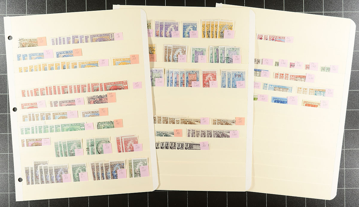 Part 3: "M" to "S" colonies. Collector’s neatly organized duplicates of several formerly French administered colonies in Africa. Mint and used, with up to a dozen of a type, with some nice cancels, "back of the book" with items identified by Scott number and (older) catalogue values. Some highlights include: a bit of Mali (#C5-C8), Mauritania, some Mayotte "Navigation and Commerce" (same for Moheli, Nossi-be and Ste Marie de Madagascar). There are touches of Obock, Rouad, a few pages of "Oubangi-Chari" overprints and more! Not often seen material, in very nice condition, with values that will add up quickly (as there are sets and singles with catalogue values to $30.00). 30 manila stockpages. Estimate =
