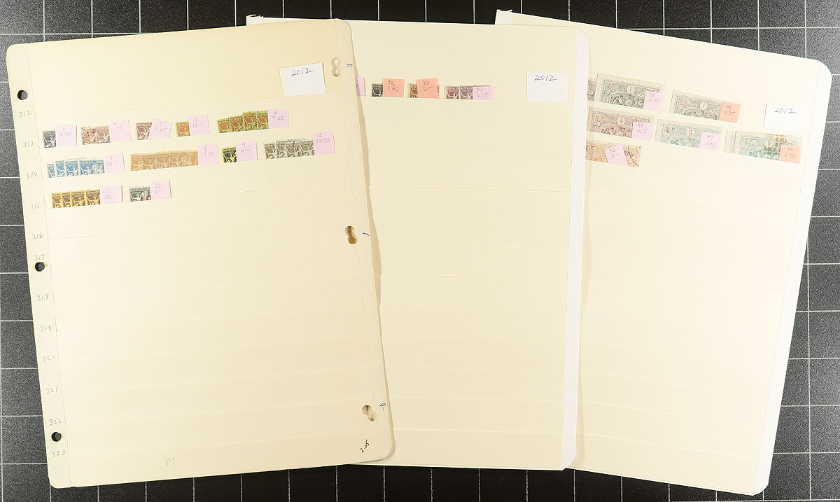 Part 3: "M" to "S" colonies. Collector’s neatly organized duplicates of several formerly French administered colonies in Africa. Mint and used, with up to a dozen of a type, with some nice cancels, "back of the book" with items identified by Scott number and (older) catalogue values. Some highlights include: a bit of Mali (#C5-C8), Mauritania, some Mayotte "Navigation and Commerce" (same for Moheli, Nossi-be and Ste Marie de Madagascar). There are touches of Obock, Rouad, a few pages of "Oubangi-Chari" overprints and more! Not often seen material, in very nice condition, with values that will add up quickly (as there are sets and singles with catalogue values to $30.00). 30 manila stockpages. Estimate =