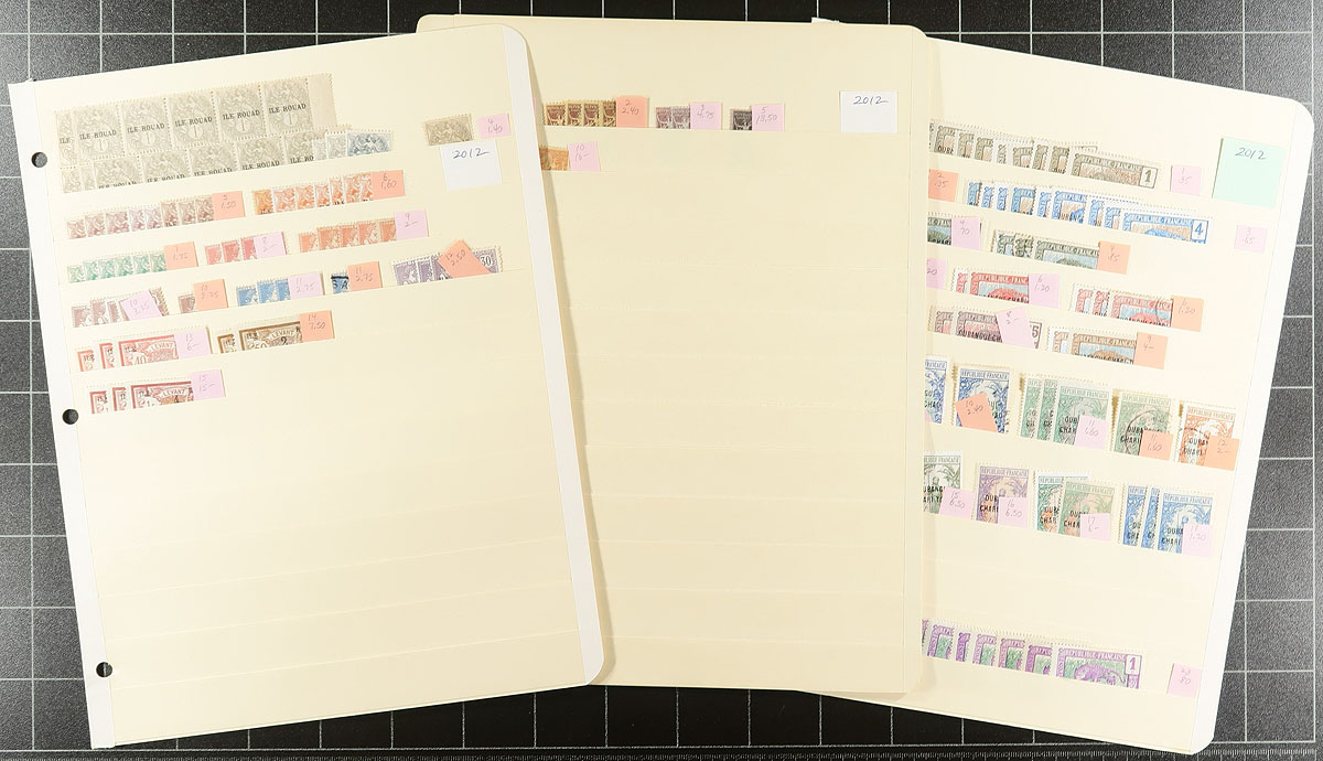Part 3: "M" to "S" colonies. Collector’s neatly organized duplicates of several formerly French administered colonies in Africa. Mint and used, with up to a dozen of a type, with some nice cancels, "back of the book" with items identified by Scott number and (older) catalogue values. Some highlights include: a bit of Mali (#C5-C8), Mauritania, some Mayotte "Navigation and Commerce" (same for Moheli, Nossi-be and Ste Marie de Madagascar). There are touches of Obock, Rouad, a few pages of "Oubangi-Chari" overprints and more! Not often seen material, in very nice condition, with values that will add up quickly (as there are sets and singles with catalogue values to $30.00). 30 manila stockpages. Estimate =