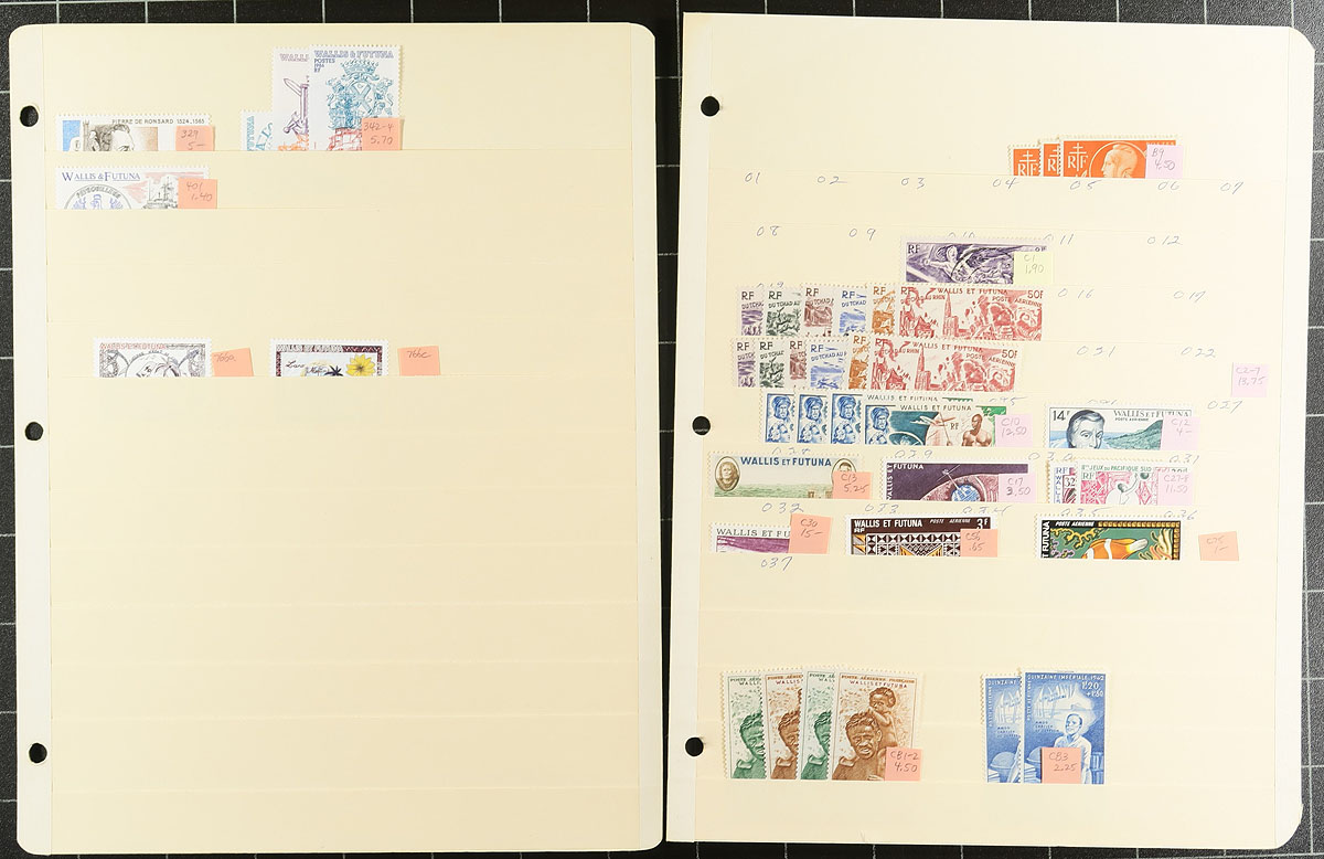 A collector’s stock of two French Pacific colonies, neatly organized on manila stockpages. Includes a nice selection of New Hebrides (noting #5, #9, #108, #185 (all used), and mint 1948 UPU (5 sets), #109, #110, #122 (x6). Wallis and Futuna has a good range of overprints, including some "France Libre" and some nice air mail material. Both mint and used, with up to a dozen of a type, all identified by Scott numbers and (older) catalogue prices (saw items up to $25.00 catalogue value). Estimate =