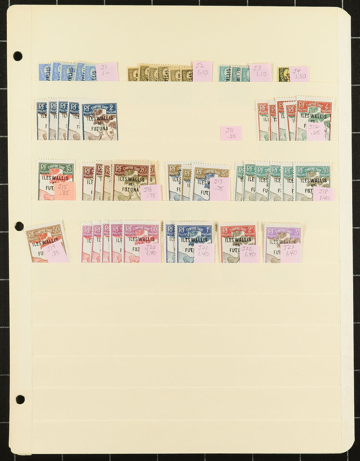 A collector’s stock of two French Pacific colonies, neatly organized on manila stockpages. Includes a nice selection of New Hebrides (noting #5, #9, #108, #185 (all used), and mint 1948 UPU (5 sets), #109, #110, #122 (x6). Wallis and Futuna has a good range of overprints, including some "France Libre" and some nice air mail material. Both mint and used, with up to a dozen of a type, all identified by Scott numbers and (older) catalogue prices (saw items up to $25.00 catalogue value). Estimate =