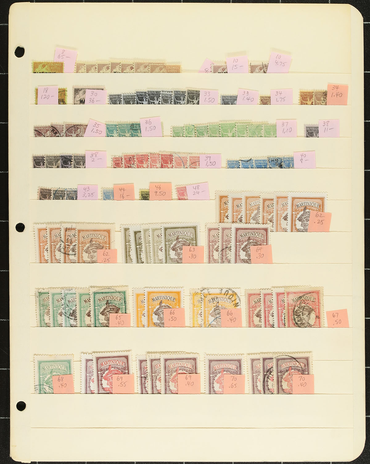 Not often seen pre-1950 French Caribbean colonial issues on a half dozen manila stockpages, with a mix of mint and used stamps, of up to 10 of a type all identified by Scott with (older) catalogue values. Better includes #8, #18 and #48 (all used), #30, #128, #176 (mint). Very nice condition, perfect for building a collection or stock. Estimate =