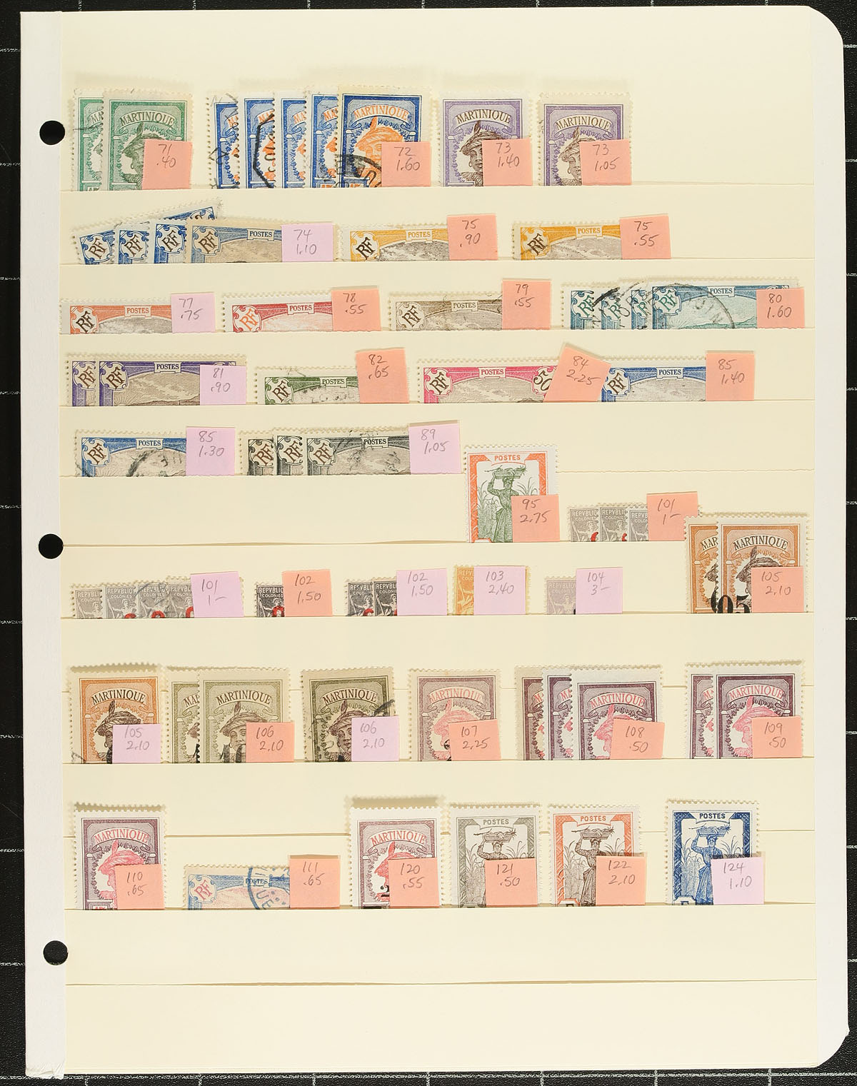 Not often seen pre-1950 French Caribbean colonial issues on a half dozen manila stockpages, with a mix of mint and used stamps, of up to 10 of a type all identified by Scott with (older) catalogue values. Better includes #8, #18 and #48 (all used), #30, #128, #176 (mint). Very nice condition, perfect for building a collection or stock. Estimate =
