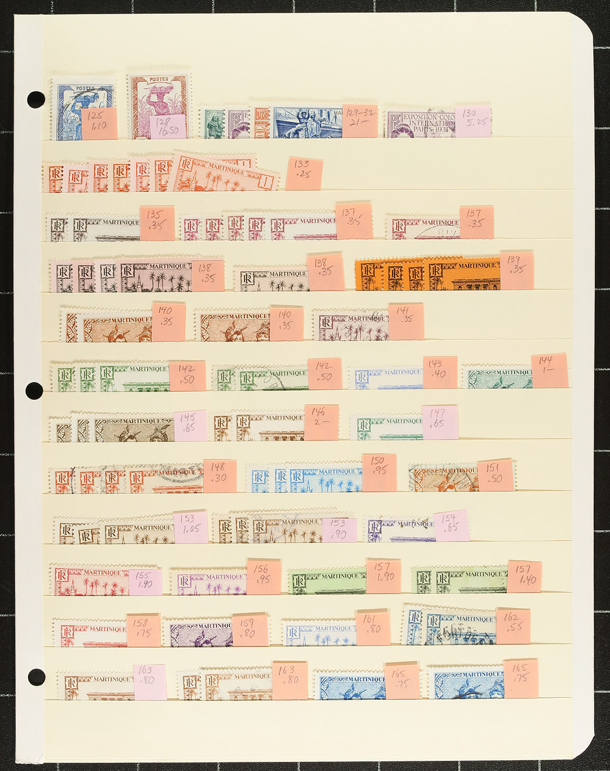 Not often seen pre-1950 French Caribbean colonial issues on a half dozen manila stockpages, with a mix of mint and used stamps, of up to 10 of a type all identified by Scott with (older) catalogue values. Better includes #8, #18 and #48 (all used), #30, #128, #176 (mint). Very nice condition, perfect for building a collection or stock. Estimate =
