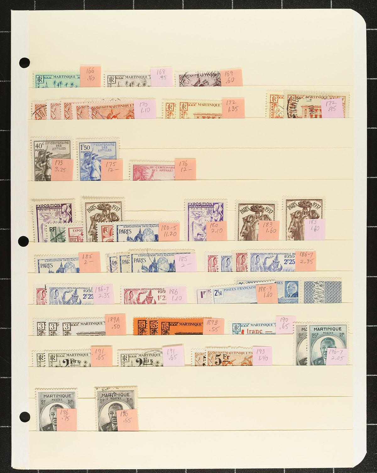 Not often seen pre-1950 French Caribbean colonial issues on a half dozen manila stockpages, with a mix of mint and used stamps, of up to 10 of a type all identified by Scott with (older) catalogue values. Better includes #8, #18 and #48 (all used), #30, #128, #176 (mint). Very nice condition, perfect for building a collection or stock. Estimate =