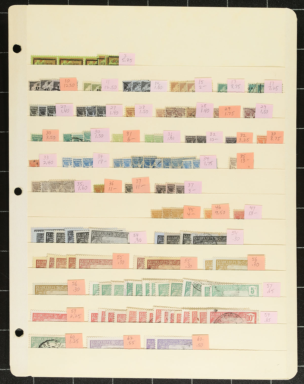 Not often seen pre-1950 French Caribbean colonial issues on a half dozen manila stockpages, with a mix of mint and used stamps, of up to a dozen of a type all identified by Scott with (older) catalogue values. The best material has been mounted on a black card, including the early overprints and the "Navigation and Commerce" issues, with a nice mint copy of #38 being the highlight. Lots of classic French colonial issues, with some cancel potential. and a bit from the back of the book. Very nice condition, perfect for building a collection or stock. Estimate =