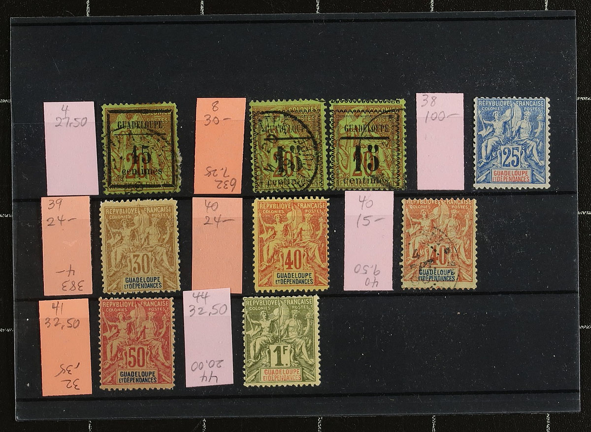 Not often seen pre-1950 French Caribbean colonial issues on a half dozen manila stockpages, with a mix of mint and used stamps, of up to a dozen of a type all identified by Scott with (older) catalogue values. The best material has been mounted on a black card, including the early overprints and the "Navigation and Commerce" issues, with a nice mint copy of #38 being the highlight. Lots of classic French colonial issues, with some cancel potential. and a bit from the back of the book. Very nice condition, perfect for building a collection or stock. Estimate =
