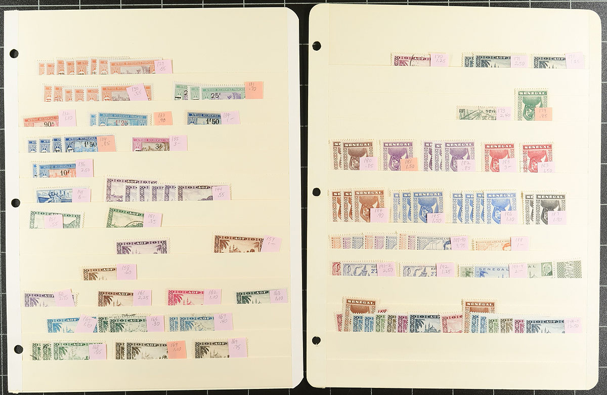 An uncommon collector’s holding of mint and used issues from the French colonial period up to the 1980's, including "back of the book". Well organized, with individual items listed by Scott number and duplication up to about 8 of a type. The best is the "Navigation and Commerce" issue including 3 mint copies of #46 and 4 each of #49-50, the black page alone catalogues US$1110.00. The balance includes sets and singles with catalogue values up to $35.00. Most are housed on manila stock pages. Don’t wait for the next one! Estimate =
