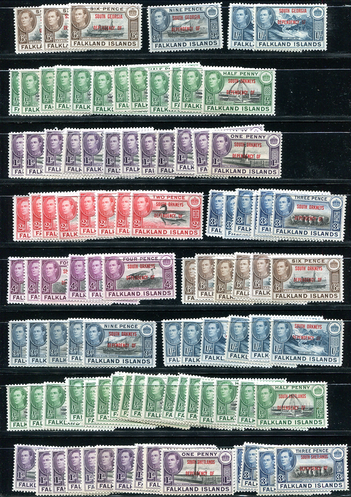 Mint wholesale lot of the 1944 "Separate Islands" overprints on 8 King George VI denominations. There are roughly equal contents from "Graham", "South Orkney" and "South Shetland" islands, and it is a bit lighter for "South Georgia". The good news is that there are good quantities of the 6d value from each set, so rounding out complete sets of each will not be too difficult. Another observation is that the quality is generally excellent, the stamps being fresh and (mostly) very lightly hinged. Total 2024 Scott US$585.55 =
