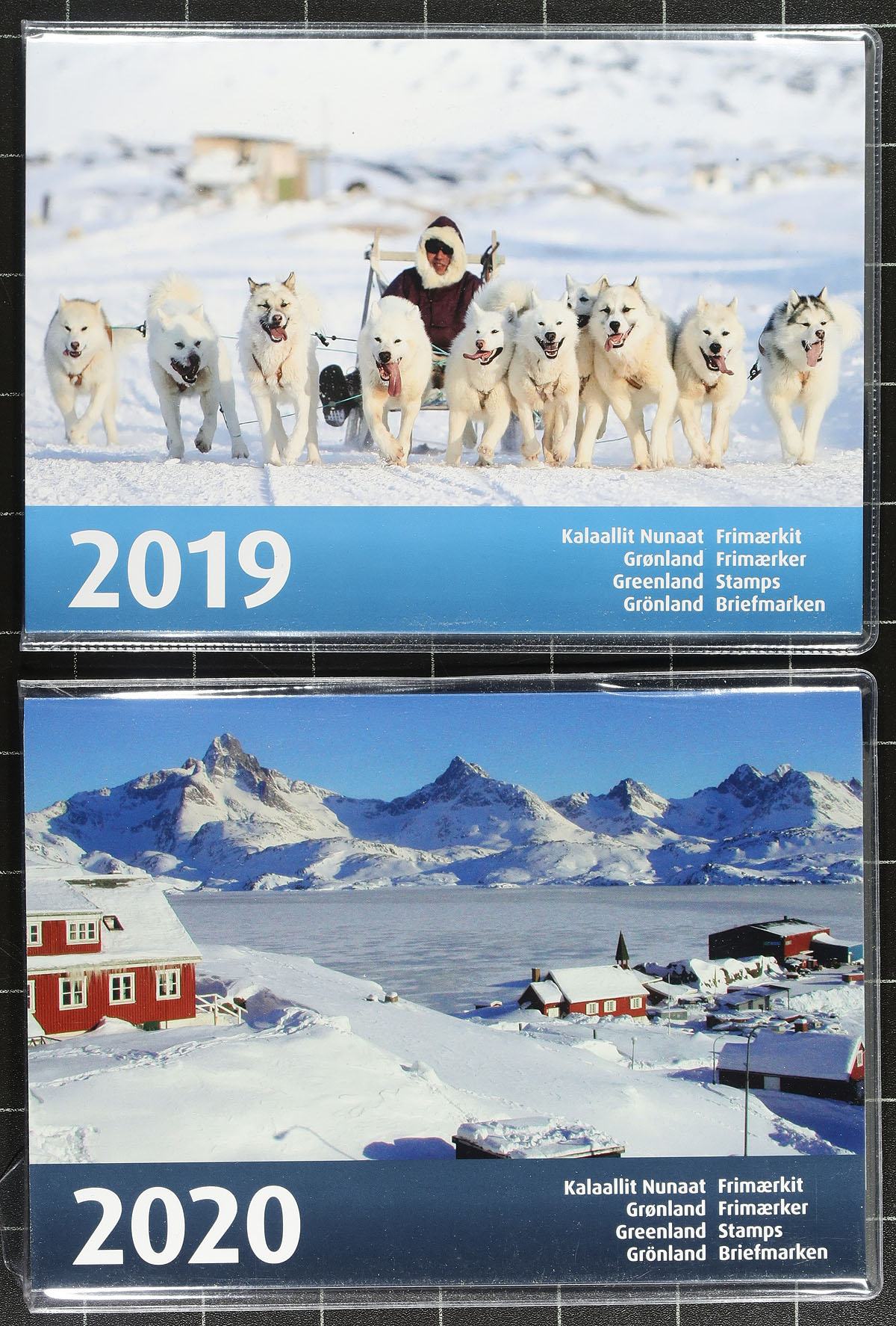 Four complete year folders for 2017-2020 including all regular issue and semi-postal stamps with souvenir sheets but no booklets or different perforations. Includes great topical interest, low print quantities and eye-watering face value. Near new condition (most still factory sealed), the stamps are very fine, mint, never hinged. Material this modern not often seen. Bonus material is a folder and booklet from GreenlandPost promoting Greenland philately. Total 2024 Scott US$604.00 =