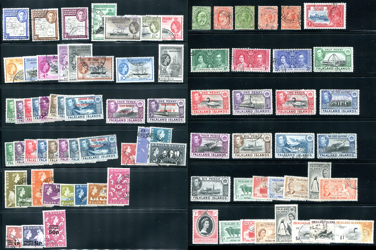 A two-page offering from these South Atlantic British colonies, starting with King Edward VII and moving into the early Elizabethan era. Best is the King George VI and early QEII issues, with three "thin map" variants, two complete "Separate Islands" overprints (Graham Land and South Orkneys). The South Georgia is from the first issue with values to 10/- and three overprints. Lots of nice cancels throughout and only a couple of minor faults are noted. Total 2024 Scott US$301.75 =