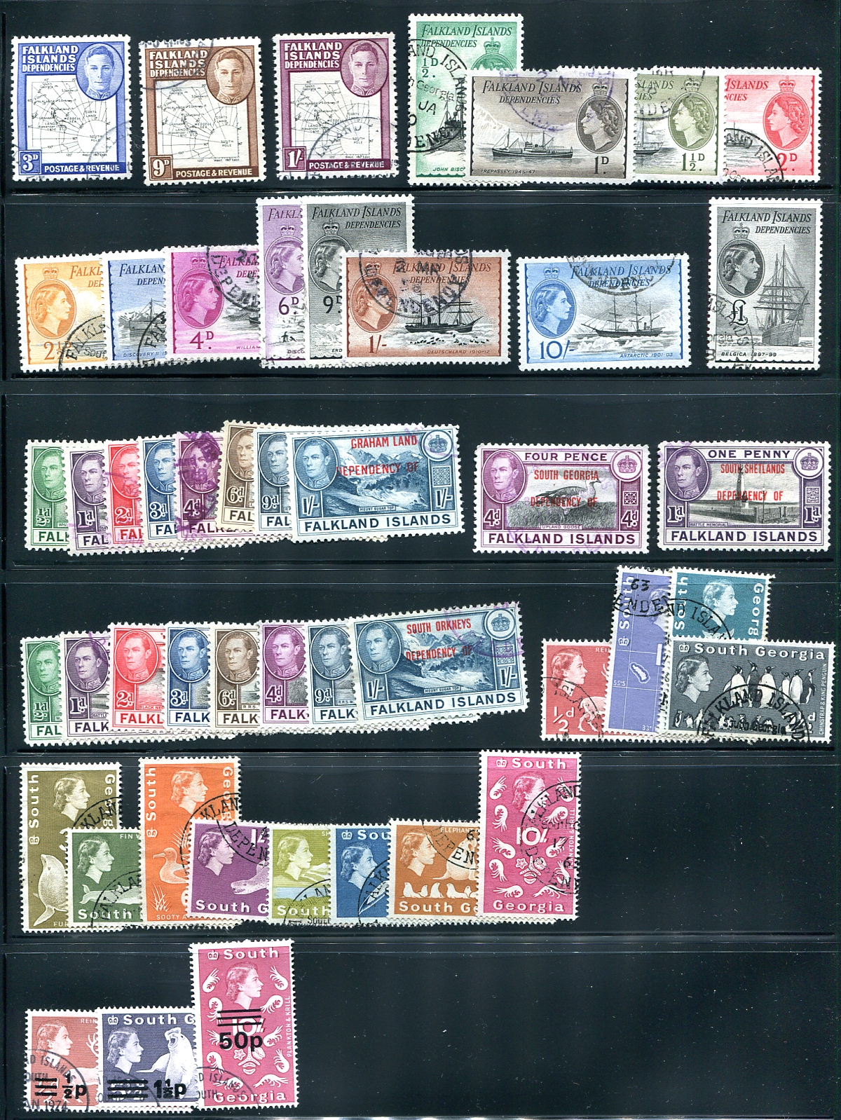 A two-page offering from these South Atlantic British colonies, starting with King Edward VII and moving into the early Elizabethan era. Best is the King George VI and early QEII issues, with three "thin map" variants, two complete "Separate Islands" overprints (Graham Land and South Orkneys). The South Georgia is from the first issue with values to 10/- and three overprints. Lots of nice cancels throughout and only a couple of minor faults are noted. Total 2024 Scott US$301.75 =