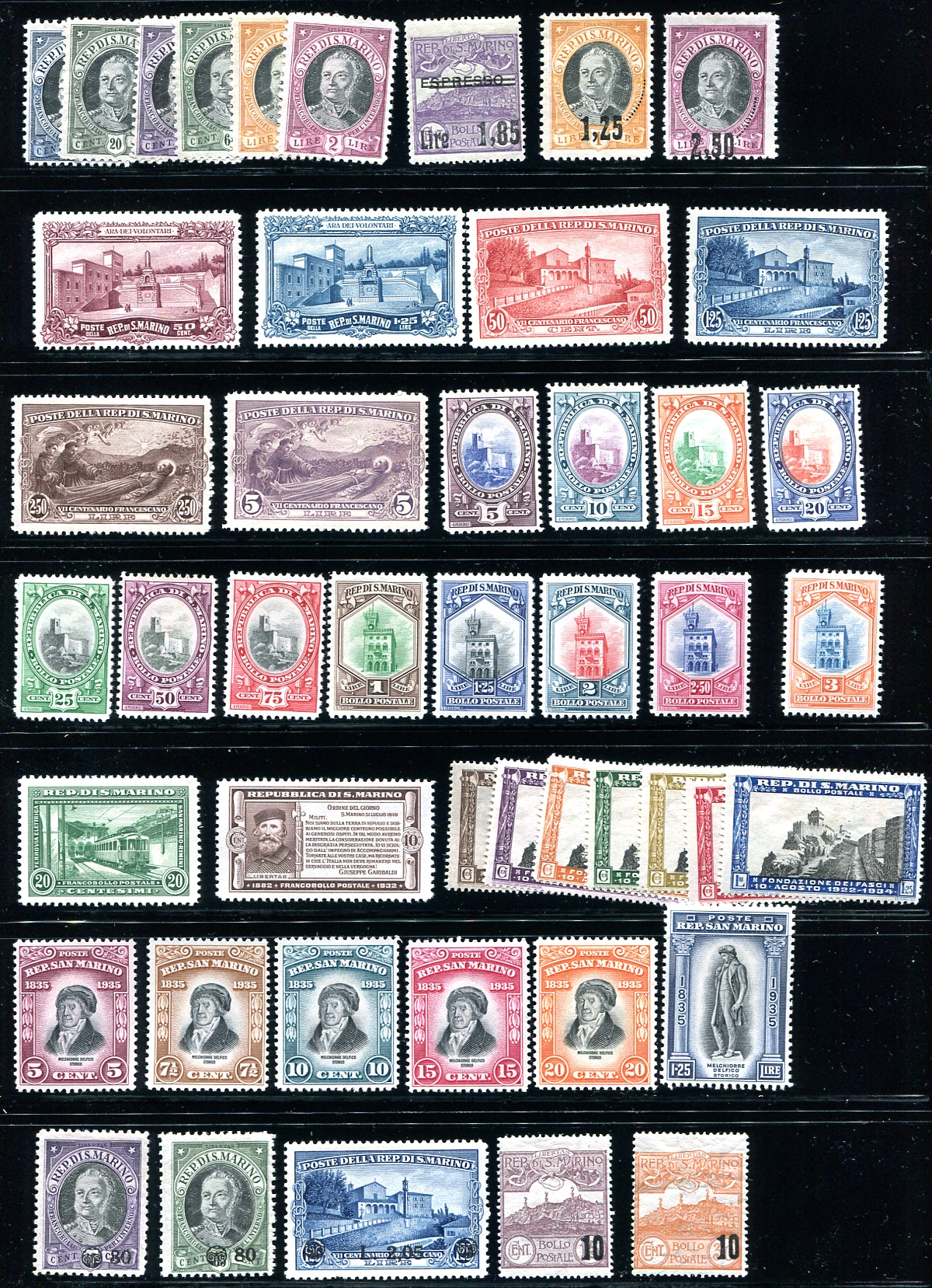 Attractive two-page selection of mint regular issue sets and singles pre-WWII. Better individual stamps include #11, #31, #79 and the St. Francis d’Assisi set #111-114. Some of the earlier are heavily hinged (as is usually the case) with hinging getting progressively lighter over time. 2024 Scott US$647.50 =