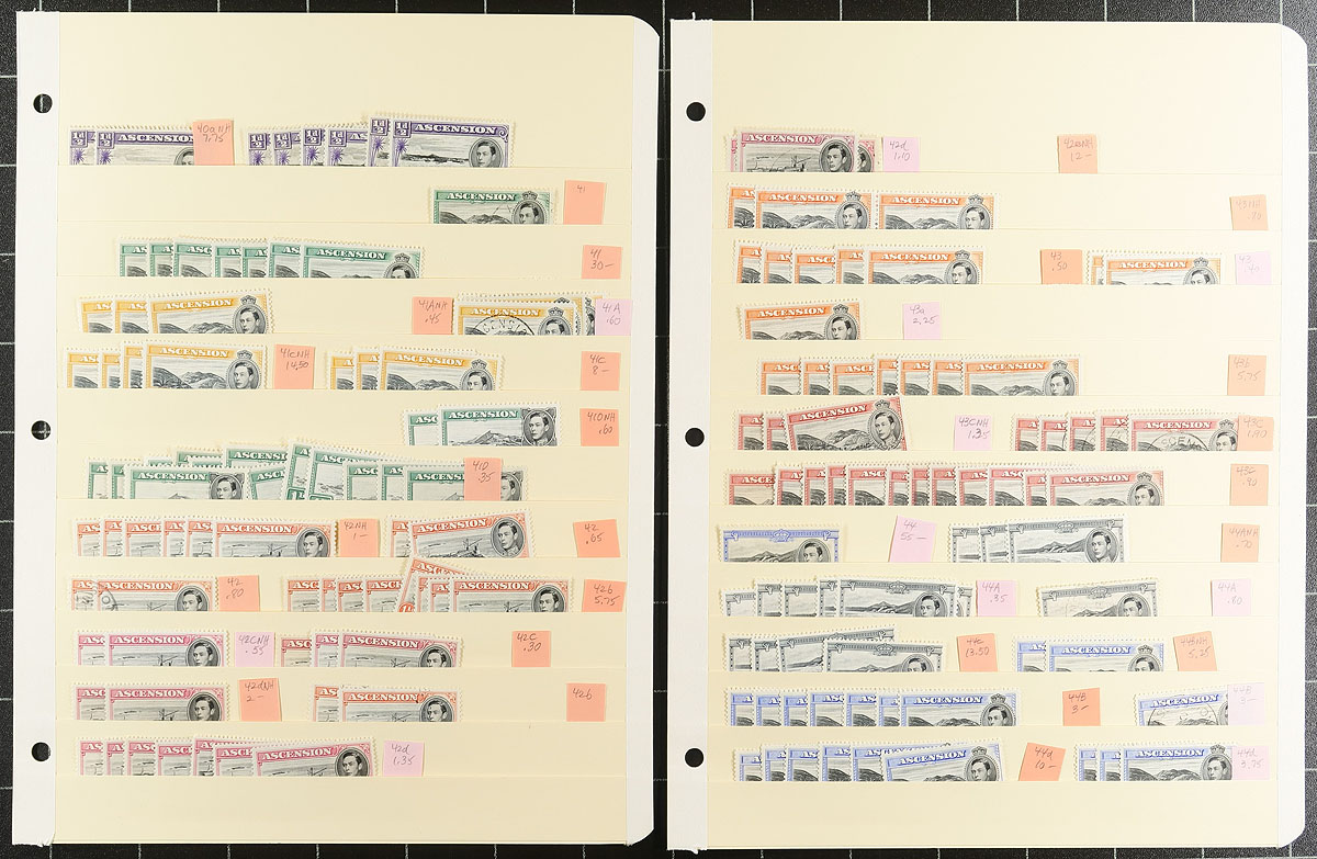 One collector’s mint and used duplicates on 14 manila stockpages, all neatly mounted with Scott numbers and slightly older catalogue prices (won’t be far off current prices). Includes a number of items of up to $20.00 catalogue value, with some shades and perforation variants identified. There are some overprints on St. Helena issues, a selection of 1935 Silver Jubilee values, and lots of exploring in the King George VI "long" issue, with values to the 5/- and a hit or miss selection through the Queen Elizabeth era up to about 1985. There is some moderate duplication with some issues having about 15 of a type. Some nice cancels are found lurking in the used material. Substantial catalogue value here, and very few faults are to be expected. Estimate =