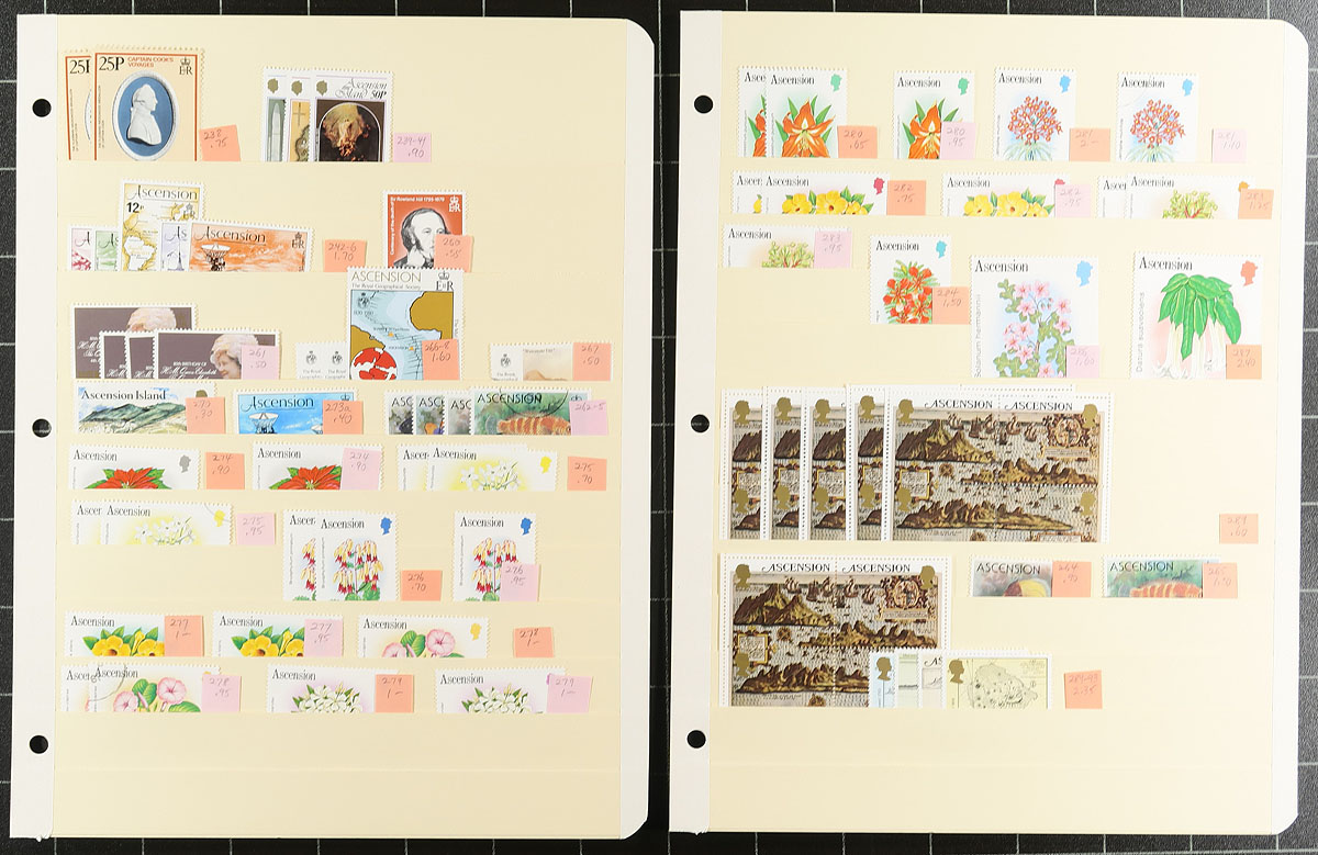 One collector’s mint and used duplicates on 14 manila stockpages, all neatly mounted with Scott numbers and slightly older catalogue prices (won’t be far off current prices). Includes a number of items of up to $20.00 catalogue value, with some shades and perforation variants identified. There are some overprints on St. Helena issues, a selection of 1935 Silver Jubilee values, and lots of exploring in the King George VI "long" issue, with values to the 5/- and a hit or miss selection through the Queen Elizabeth era up to about 1985. There is some moderate duplication with some issues having about 15 of a type. Some nice cancels are found lurking in the used material. Substantial catalogue value here, and very few faults are to be expected. Estimate =