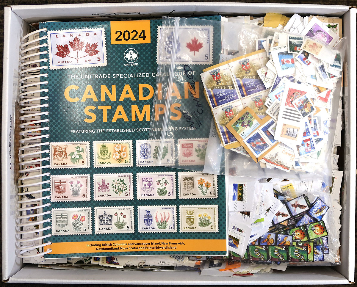 Kiloware. A banker's box filled to the top with 22lbs of single close-cut paper and off-paper, with lots of modern definitives. Includes a 2024 Canada Specialized Unitrade catalogue and a baggie with uncanceled stamps. Estimate =