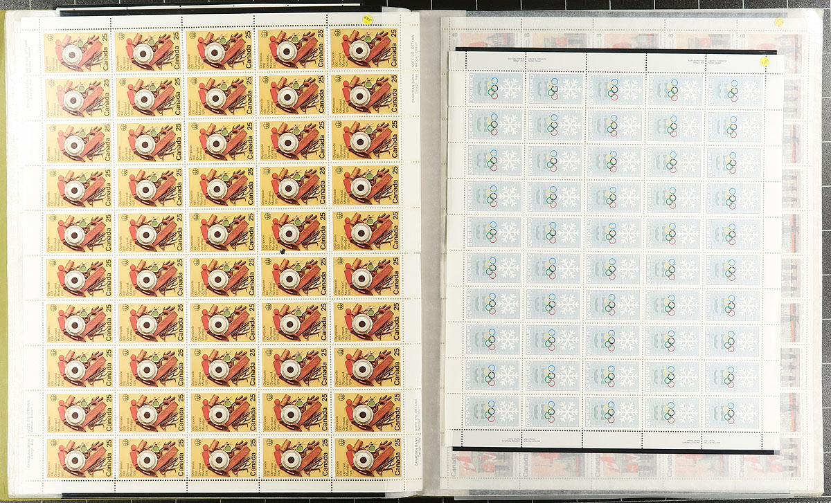 Pristine collection of 51 different mint Never Hinged complete sheets from the 1972-1979 period, all neatly arranged and identified by the owner in a sheet-file folder. Includes better such as the 1973 Royal Visit 15c, 1976 Olympics 20c / 25c values etc. Face value alone adds up to $327.25. Owner's 2024 Scott value US$1315.00 =