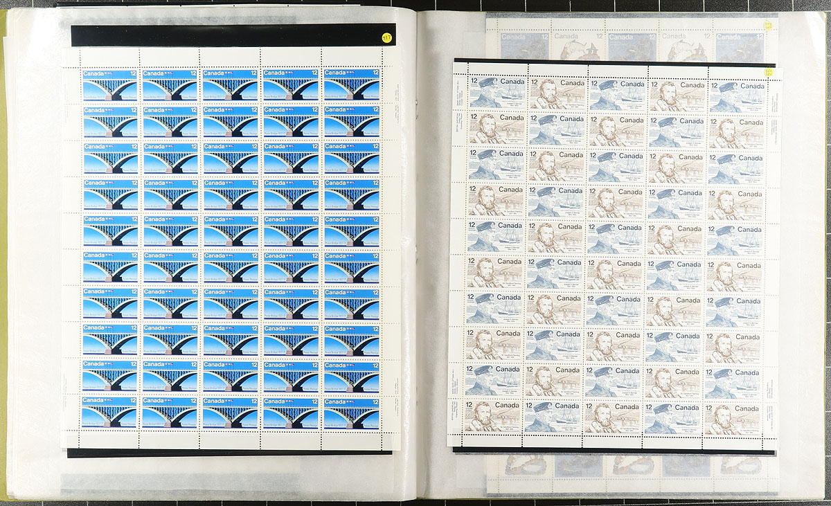 Pristine collection of 51 different mint Never Hinged complete sheets from the 1972-1979 period, all neatly arranged and identified by the owner in a sheet-file folder. Includes better such as the 1973 Royal Visit 15c, 1976 Olympics 20c / 25c values etc. Face value alone adds up to $327.25. Owner's 2024 Scott value US$1315.00 =