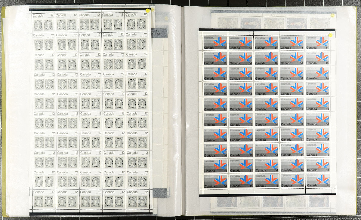 Pristine collection of 51 different mint Never Hinged complete sheets from the 1972-1979 period, all neatly arranged and identified by the owner in a sheet-file folder. Includes better such as the 1973 Royal Visit 15c, 1976 Olympics 20c / 25c values etc. Face value alone adds up to $327.25. Owner's 2024 Scott value US$1315.00 =