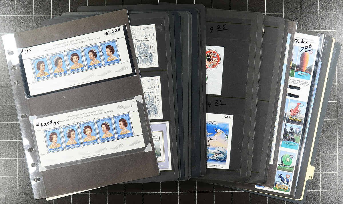 Attractive group of never hinged New Zealand souvenir sheets and booklets, 1974-1996, containing roughly 85 different souvenir sheets and 15 booklets (or panes), in many stock pages housed in a binder. Many of the items have been identified with Scott numbers along with older catalogue prices, noting several exhibition sheets, with several items cataloguing $5 to $10 and up each. Face value alone would be at least a couple hundred dollars. The lot also includes a few never hinged singles and souvenir sheets. Lovely lot with a wide variety of purposes. 2026 Scott US$608.00 =