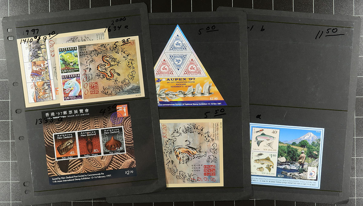 Attractive group of never hinged New Zealand souvenir sheets and booklets, 1974-1996, containing roughly 85 different souvenir sheets and 15 booklets (or panes), in many stock pages housed in a binder. Many of the items have been identified with Scott numbers along with older catalogue prices, noting several exhibition sheets, with several items cataloguing $5 to $10 and up each. Face value alone would be at least a couple hundred dollars. The lot also includes a few never hinged singles and souvenir sheets. Lovely lot with a wide variety of purposes. 2026 Scott US$608.00 =