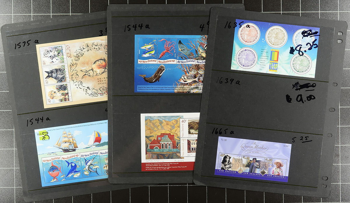 Attractive group of never hinged New Zealand souvenir sheets and booklets, 1974-1996, containing roughly 85 different souvenir sheets and 15 booklets (or panes), in many stock pages housed in a binder. Many of the items have been identified with Scott numbers along with older catalogue prices, noting several exhibition sheets, with several items cataloguing $5 to $10 and up each. Face value alone would be at least a couple hundred dollars. The lot also includes a few never hinged singles and souvenir sheets. Lovely lot with a wide variety of purposes. 2026 Scott US$608.00 =