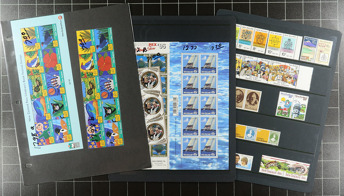 Attractive group of never hinged New Zealand souvenir sheets and booklets, 1974-1996, containing roughly 85 different souvenir sheets and 15 booklets (or panes), in many stock pages housed in a binder. Many of the items have been identified with Scott numbers along with older catalogue prices, noting several exhibition sheets, with several items cataloguing $5 to $10 and up each. Face value alone would be at least a couple hundred dollars. The lot also includes a few never hinged singles and souvenir sheets. Lovely lot with a wide variety of purposes. 2026 Scott US$608.00 =