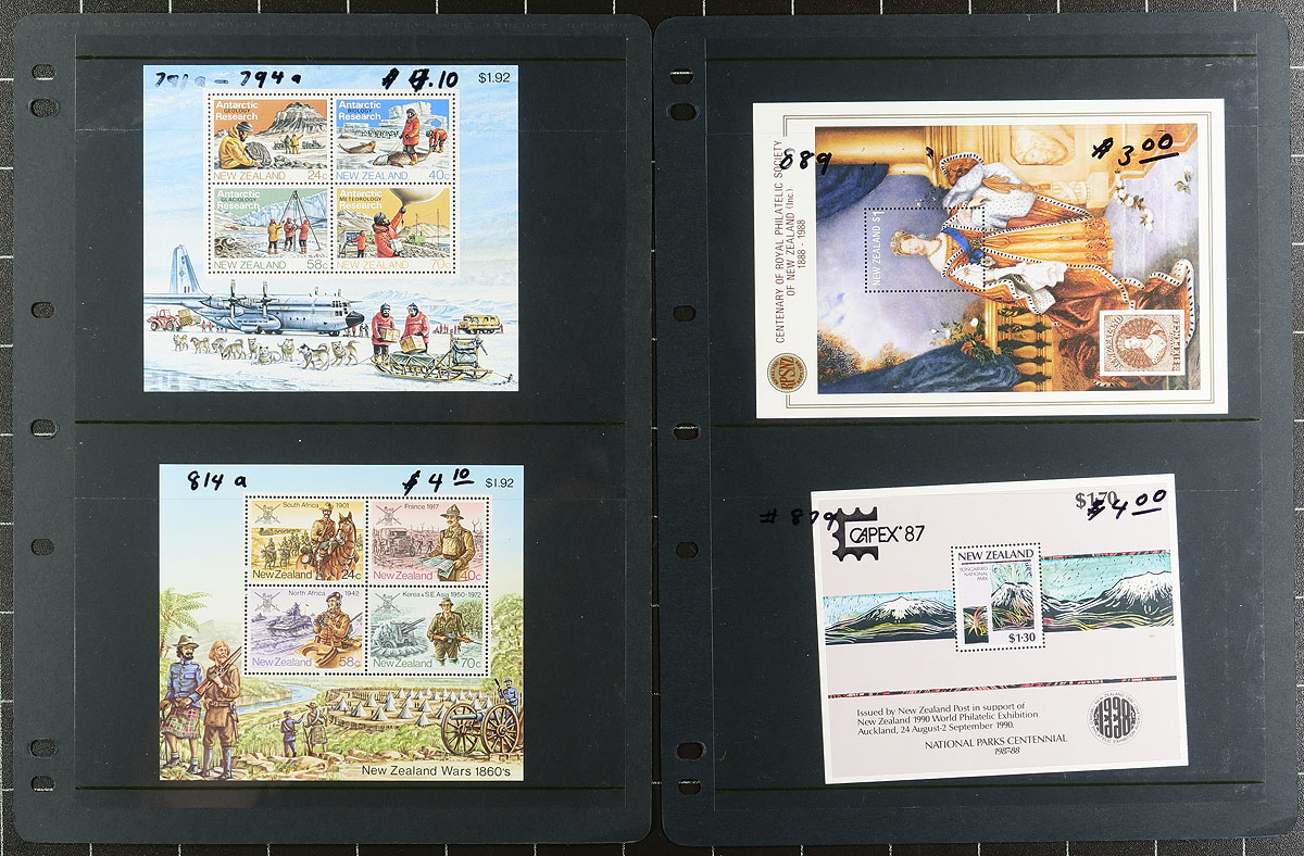 Attractive group of never hinged New Zealand souvenir sheets and booklets, 1974-1996, containing roughly 85 different souvenir sheets and 15 booklets (or panes), in many stock pages housed in a binder. Many of the items have been identified with Scott numbers along with older catalogue prices, noting several exhibition sheets, with several items cataloguing $5 to $10 and up each. Face value alone would be at least a couple hundred dollars. The lot also includes a few never hinged singles and souvenir sheets. Lovely lot with a wide variety of purposes. 2026 Scott US$608.00 =