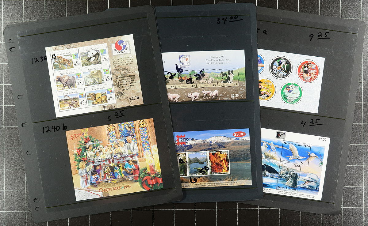 Attractive group of never hinged New Zealand souvenir sheets and booklets, 1974-1996, containing roughly 85 different souvenir sheets and 15 booklets (or panes), in many stock pages housed in a binder. Many of the items have been identified with Scott numbers along with older catalogue prices, noting several exhibition sheets, with several items cataloguing $5 to $10 and up each. Face value alone would be at least a couple hundred dollars. The lot also includes a few never hinged singles and souvenir sheets. Lovely lot with a wide variety of purposes. 2026 Scott US$608.00 =
