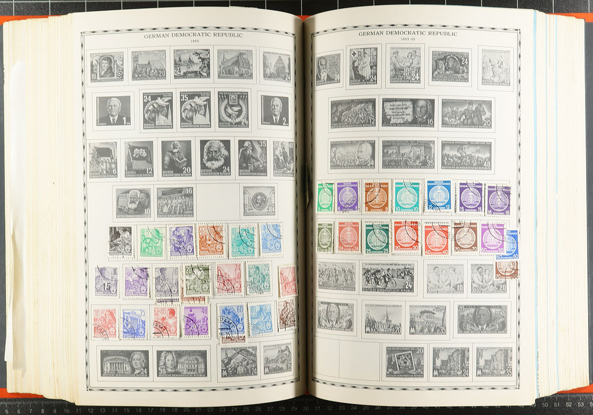 Balance of consignment containing thousands of worldwide stamps in two albums and homemade pages. The "Illustrated Around-The -World Stamp Album" and "The Comprehensive World-Wide Stamp Album" appear to be sporadically filled (we estimate 3,000 stamps in total), with better representation from European countries, generally from the 1900's to the 1970's. The homemade pages contain primarily British Commonwealth stamps (strength in Canada), from the Victorian era onwards. A nice starter group for the worldwide collector. Estimate =