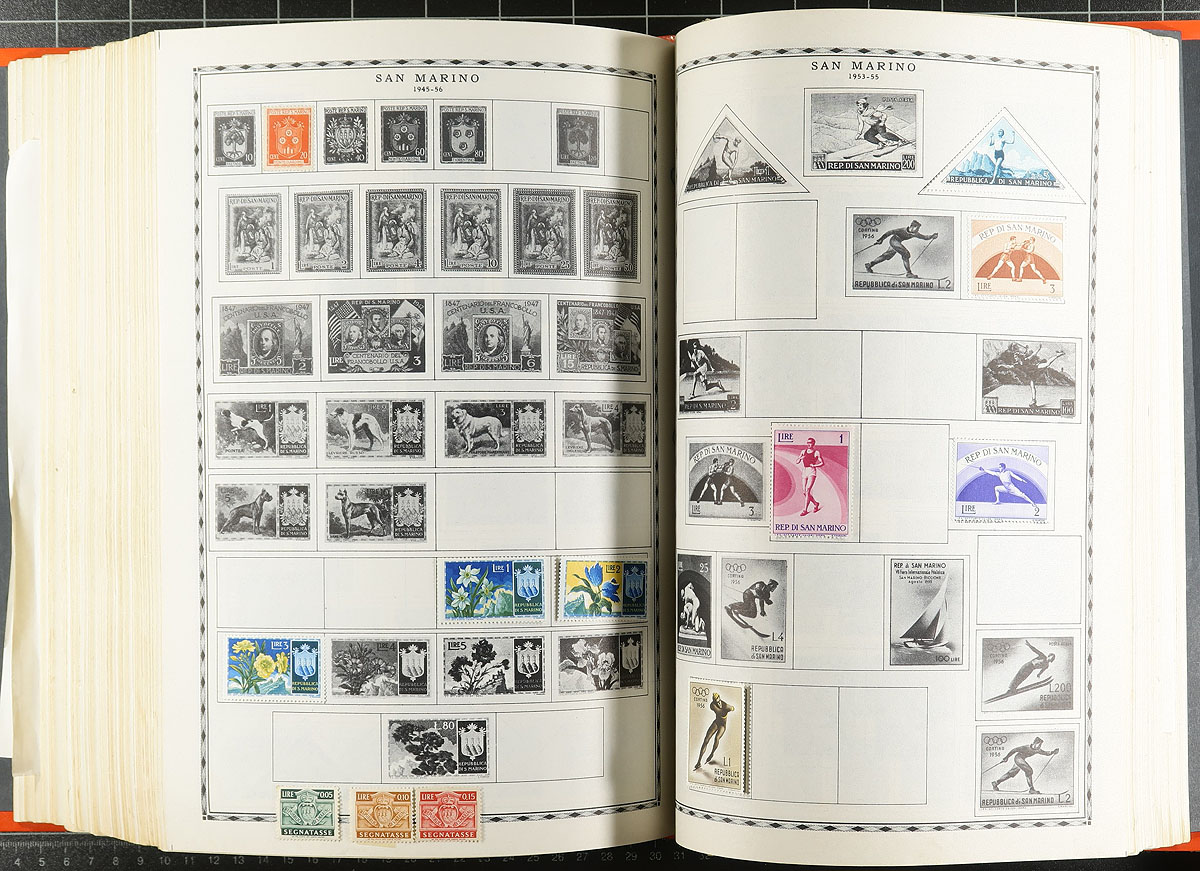 Balance of consignment containing thousands of worldwide stamps in two albums and homemade pages. The "Illustrated Around-The -World Stamp Album" and "The Comprehensive World-Wide Stamp Album" appear to be sporadically filled (we estimate 3,000 stamps in total), with better representation from European countries, generally from the 1900's to the 1970's. The homemade pages contain primarily British Commonwealth stamps (strength in Canada), from the Victorian era onwards. A nice starter group for the worldwide collector. Estimate =