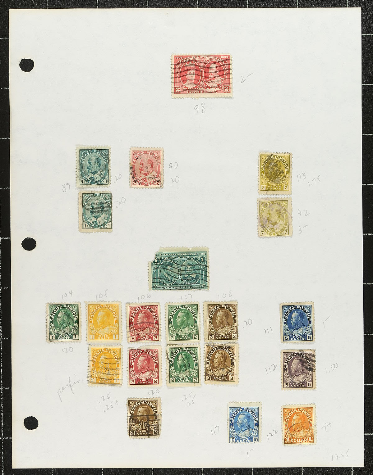 Balance of consignment containing thousands of worldwide stamps in two albums and homemade pages. The "Illustrated Around-The -World Stamp Album" and "The Comprehensive World-Wide Stamp Album" appear to be sporadically filled (we estimate 3,000 stamps in total), with better representation from European countries, generally from the 1900's to the 1970's. The homemade pages contain primarily British Commonwealth stamps (strength in Canada), from the Victorian era onwards. A nice starter group for the worldwide collector. Estimate =