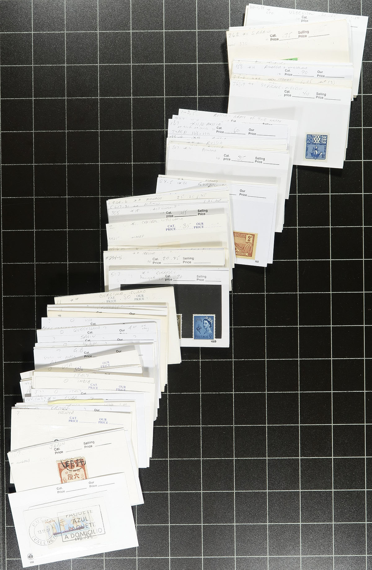 Consignment of a few thousand mint and used worldwide stamps in a variety of formats, including several 102 cards, stock pages, album pages, etc. We note singles, sets, souvenir sheets, part sheets, with better representation from Colombia, British Commonwealth countries, Italy, and more. Some of the material has been identified and priced generally ranging from $5 to $15 and up. A neat lot for the worldwide collector with possible finds to be had. Estimate =