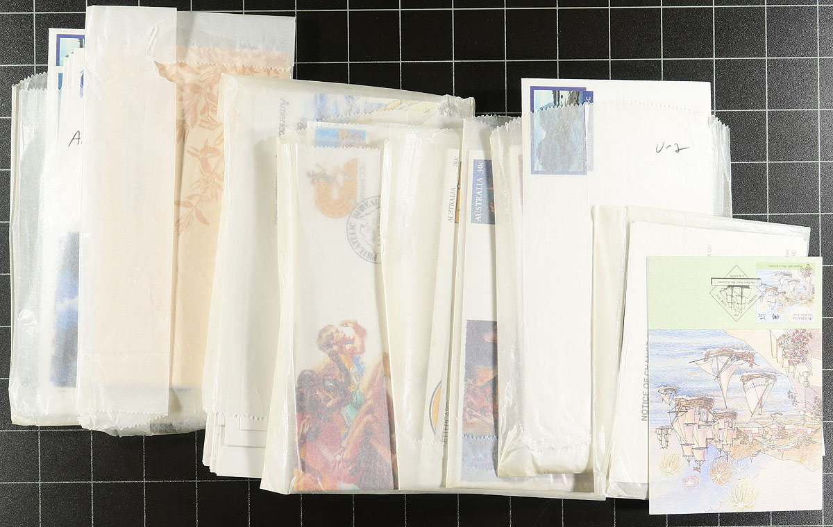 Comprehensive collection of Australia postal stationery, 1970's-1980's, containing roughly 475 pieces (mint and some with first day cancels), all purchased as new issues with the vast majority in original glassine packaging. Also includes a few sundry souvenir items. A nice lot that would be difficult to duplicate. Estimate =