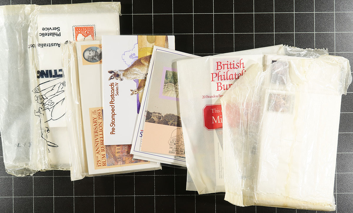 Comprehensive collection of Australia postal stationery, 1970's-1980's, containing roughly 475 pieces (mint and some with first day cancels), all purchased as new issues with the vast majority in original glassine packaging. Also includes a few sundry souvenir items. A nice lot that would be difficult to duplicate. Estimate =