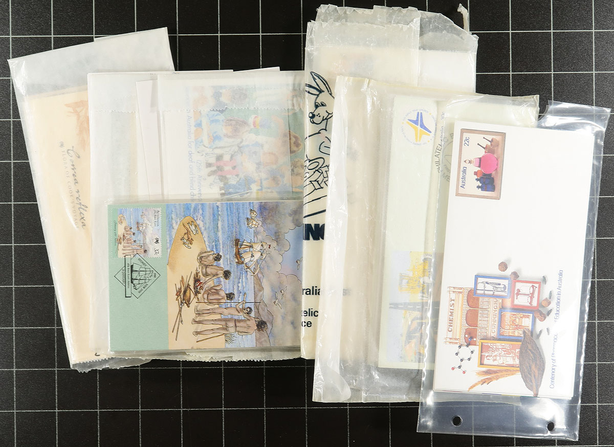 Comprehensive collection of Australia postal stationery, 1970's-1980's, containing roughly 475 pieces (mint and some with first day cancels), all purchased as new issues with the vast majority in original glassine packaging. Also includes a few sundry souvenir items. A nice lot that would be difficult to duplicate. Estimate =