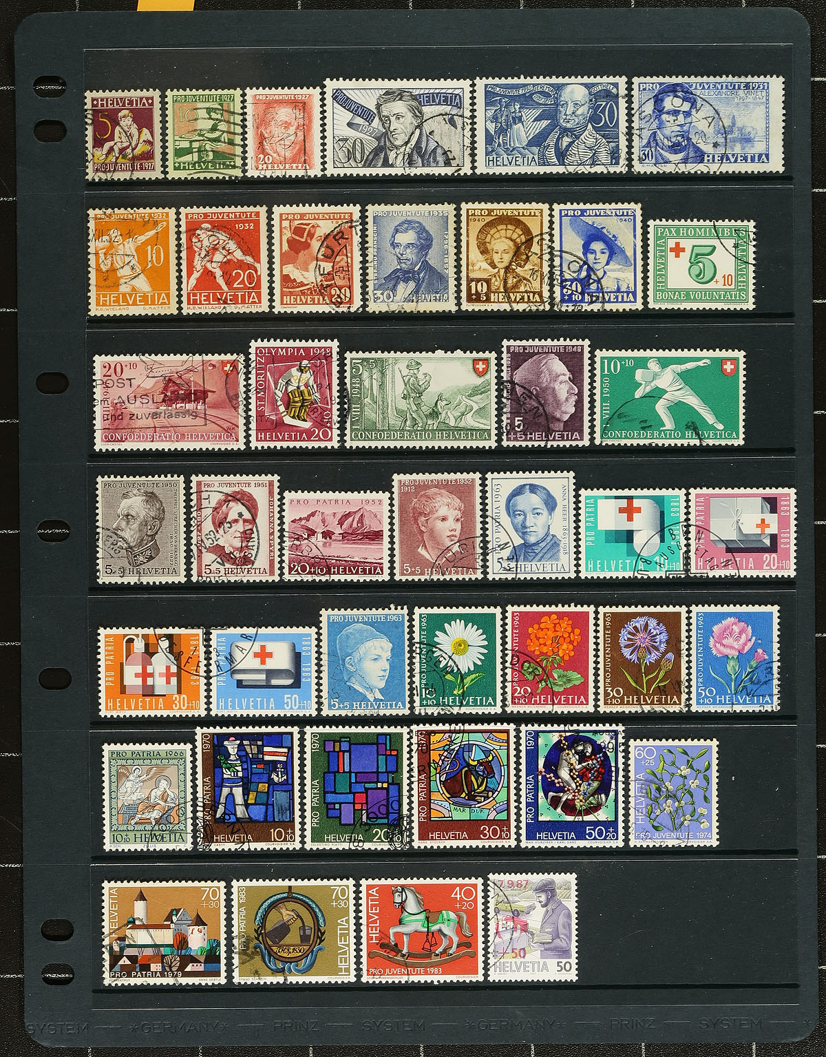 Collection of used Switzerland, 1962-2019, containing roughly 975 stamps in 21 album or stock pages. A spot check indicated single, sets, and partial sets, including semi-postals and airmails, with a good selection of early and modern issues, with strength from the 1900s to the 1960s. We note some material cataloguing in the $10 to $25 and up each, with owner's 2020 Scott catalogue value for the lot totaling US$1,065.00. Postmark interest includes cds and other town cancel types. A nice lot for Switzerland and worldwide collectors. Estimate =