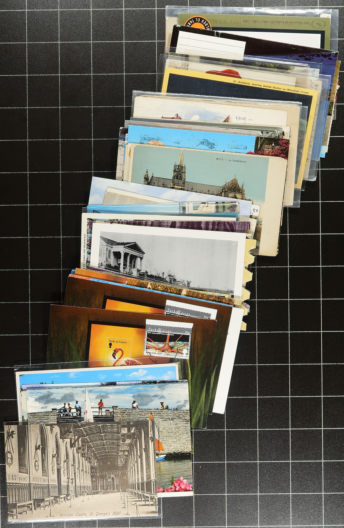 Group of roughly 500 worldwide postcards filling a shoebox. We estimate roughly half the cards are in the classic period up to the 1940's, noting real photo cards, coloured, sepia, along with modern chromes etc. Better representation from Germany, Great Britain, Australia, United States, and several other countries, encountering several popular subjects including trains, ships, military, greeting cards, humorous cards, building and scenic views, and much more. A nice lot for the enthusiast, a few faults noted, overall fine to very fine. Estimate =