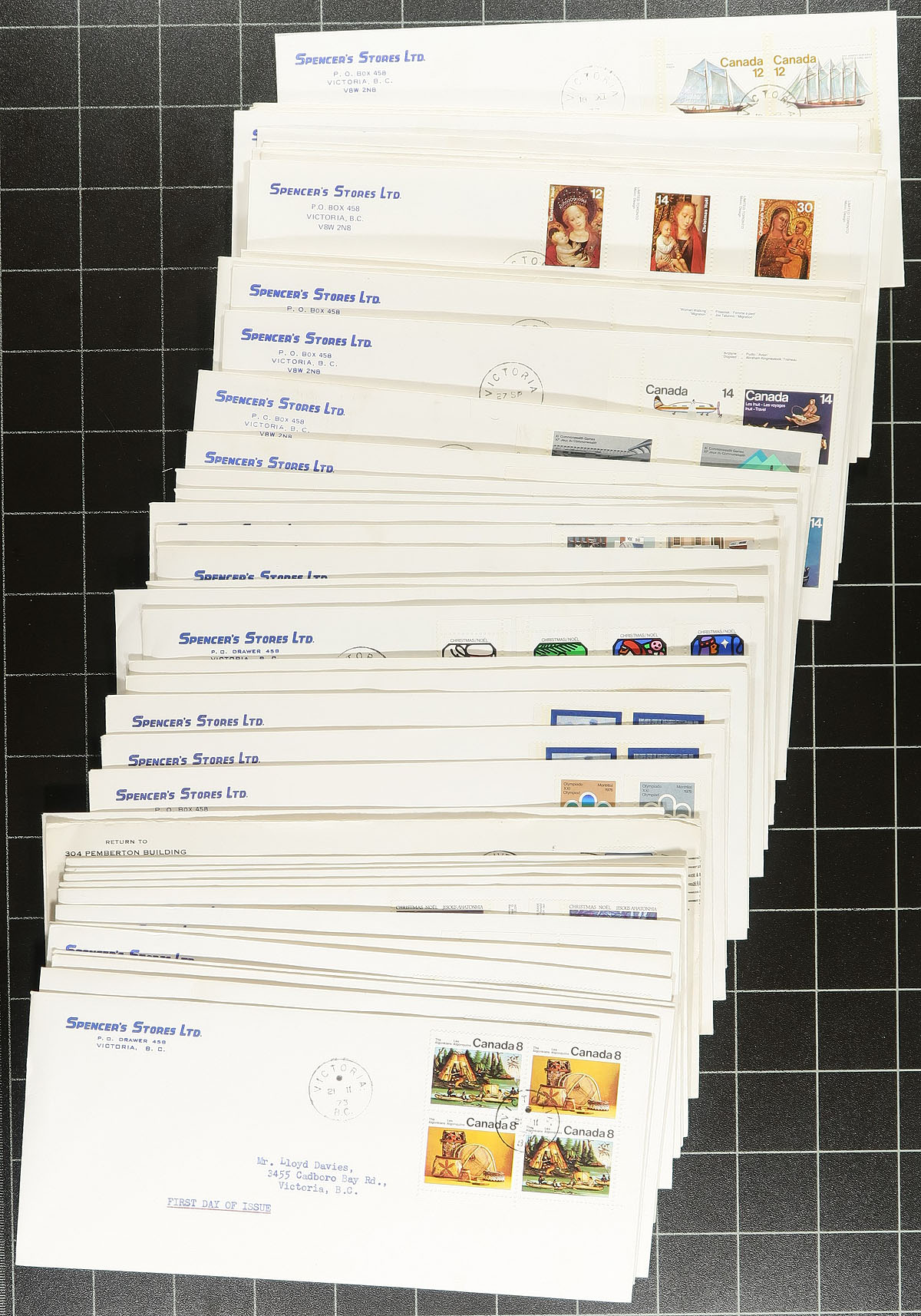 Interesting group of roughly 250 Canada first day covers, 1960's-1980, all with B.C. postmarks. The vast majority of covers have corner advertising from "Spencer's Stores Ltd", in Victoria BC, about a 15 year run of covers with singles, sets, plate blocks, and souvenir sheet frankings. Some of the other covers have private cachets and a few with no cachet at all. The overwhelming majority have Victoria B.C. postmarks, with a few other towns sprinkled in. A nice lot for the first day cover collector that would be difficult to duplicate. Estimate =