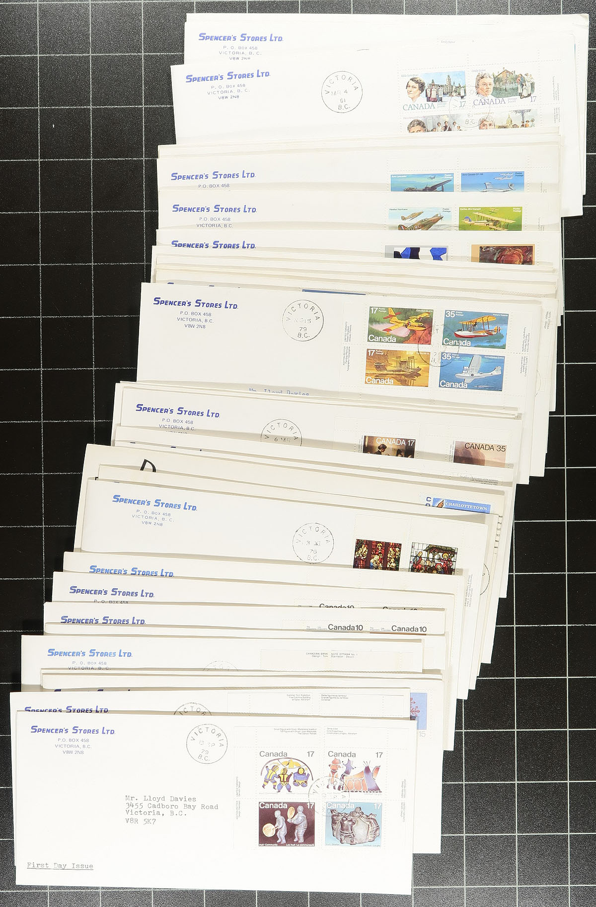 Interesting group of roughly 250 Canada first day covers, 1960's-1980, all with B.C. postmarks. The vast majority of covers have corner advertising from "Spencer's Stores Ltd", in Victoria BC, about a 15 year run of covers with singles, sets, plate blocks, and souvenir sheet frankings. Some of the other covers have private cachets and a few with no cachet at all. The overwhelming majority have Victoria B.C. postmarks, with a few other towns sprinkled in. A nice lot for the first day cover collector that would be difficult to duplicate. Estimate =