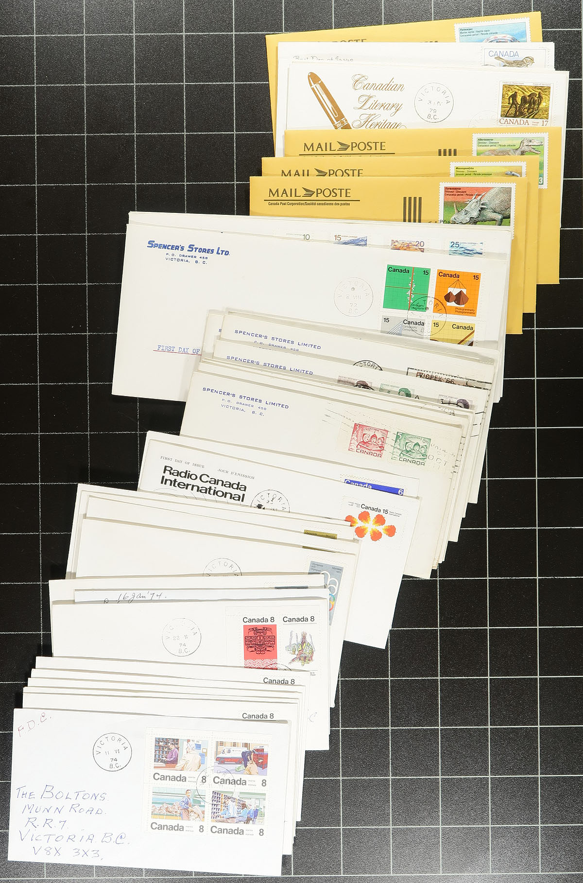 Interesting group of roughly 250 Canada first day covers, 1960's-1980, all with B.C. postmarks. The vast majority of covers have corner advertising from "Spencer's Stores Ltd", in Victoria BC, about a 15 year run of covers with singles, sets, plate blocks, and souvenir sheet frankings. Some of the other covers have private cachets and a few with no cachet at all. The overwhelming majority have Victoria B.C. postmarks, with a few other towns sprinkled in. A nice lot for the first day cover collector that would be difficult to duplicate. Estimate =