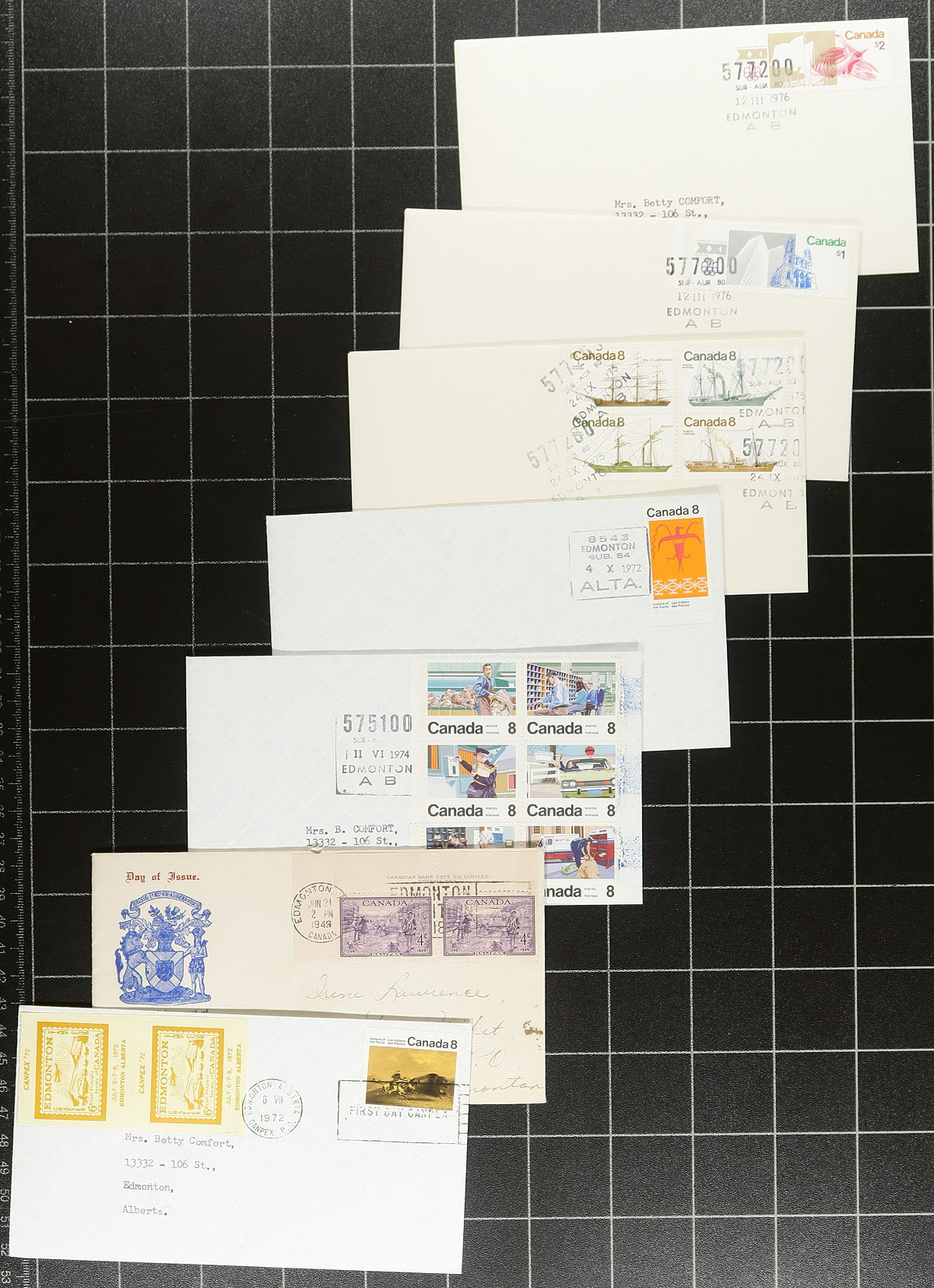 Nice collection of roughly 225 Canada first day covers with Alberta postmarks. The lot contains mostly covers from the 1970's with singles, sets, and a few block frankings, with the overwhelming majority having Edmonton POCON type postmarks from either "575100 SUB-AUX 84" or "577200 SUB-AUX 80", along with a few other postmark types. An interesting lot for the first day cover or Alberta postmark collector. Estimate =