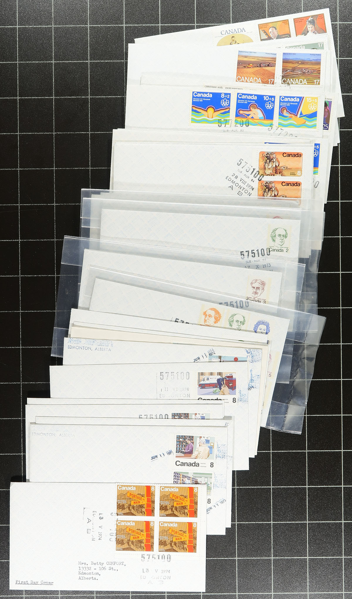 Nice collection of roughly 225 Canada first day covers with Alberta postmarks. The lot contains mostly covers from the 1970's with singles, sets, and a few block frankings, with the overwhelming majority having Edmonton POCON type postmarks from either "575100 SUB-AUX 84" or "577200 SUB-AUX 80", along with a few other postmark types. An interesting lot for the first day cover or Alberta postmark collector. Estimate =